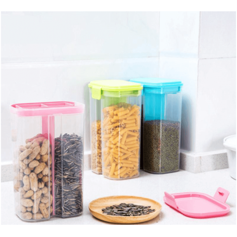 Storage containers are required in every house for storing several things. You can use them in the kitchen for storing spices, cereals, cornflakes, milk powder, tea, rice, flour, sugar, grains, pulses, etc. Apzone.pk presents you with 2 Compartment Food Storage Jar that provides you with a maximum capacity for keeping and storing a lot of things. It also helps you in keeping your kitchen and pantry well organized. Using this jar prevents the spilling of dry food which comes in plastic bags.