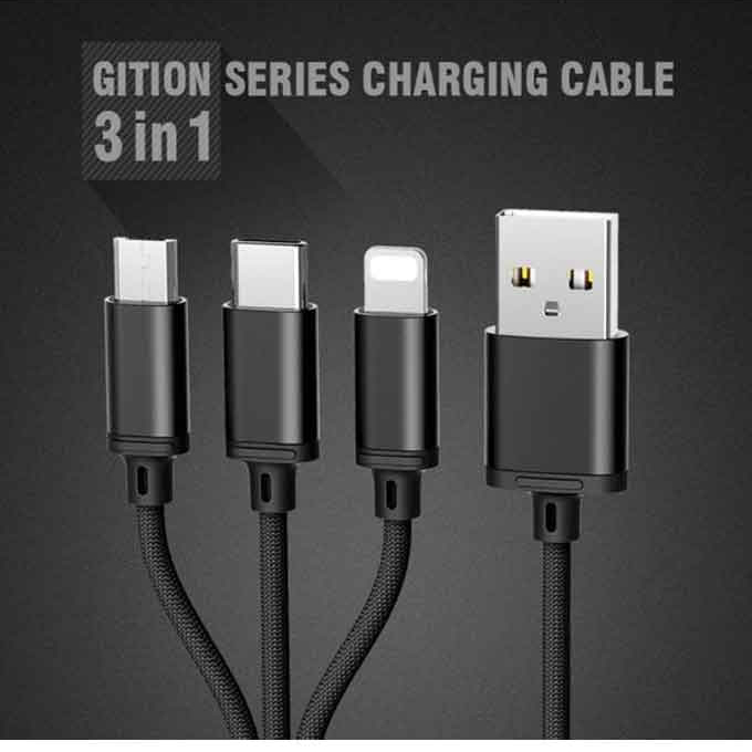 - A USB charging cable with 3 different plugs: USB-C / micro USB / Lightning