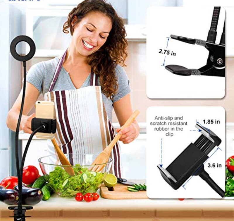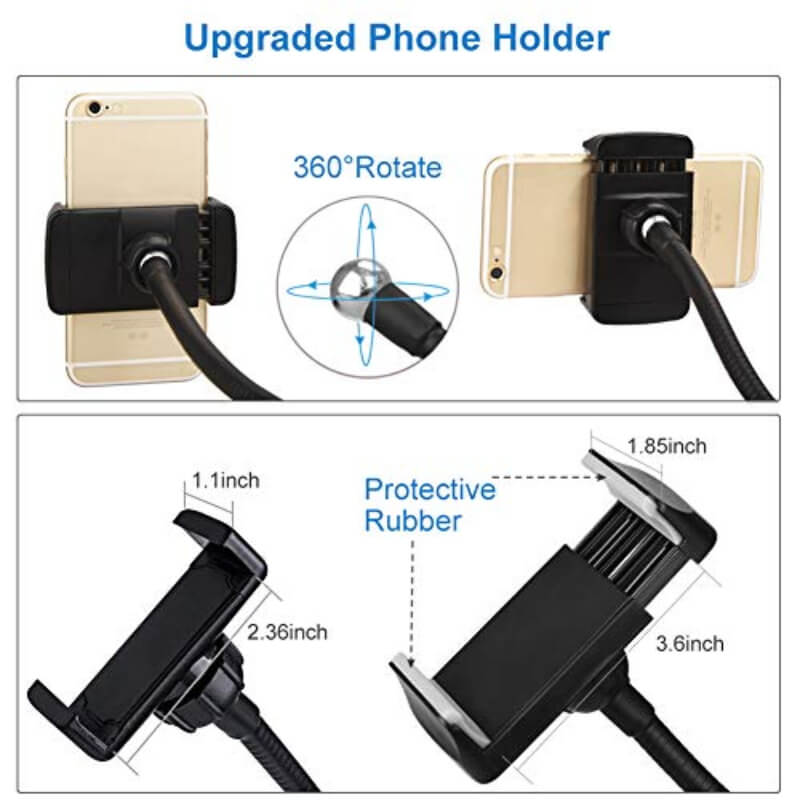 Ring light mobile holder has flexible arms that make the stand easy to control yet it is strong enough to set in different positions. You can twist the arm to fit your need in any direction. This provides you with perfect angle for taking selfies. You can also bend them for the purpose of travelling. It is rotatable to 360 degrees to capture the beauty of a landscape or s portrait or any other orientation from every possible angle.