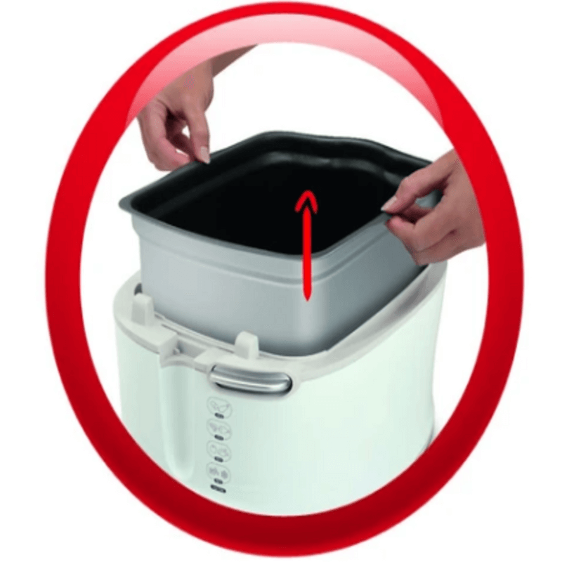 This Moulinex fryer has a digital timer also that shows you the time you set and the remaining time. It has a lid along with a control window. It consists of a carbon filter that minimizes the odor and is highly efficient in doing so. It is dishwasher safe as the tank is removable. The headband is made of stainless steel. The outer walls are cool to touch. It also features an automatic lid opening for your convenience. You can open the id by pressing the button. There is also a switch for turning it on/off, a metal control panel, and an indicator light.