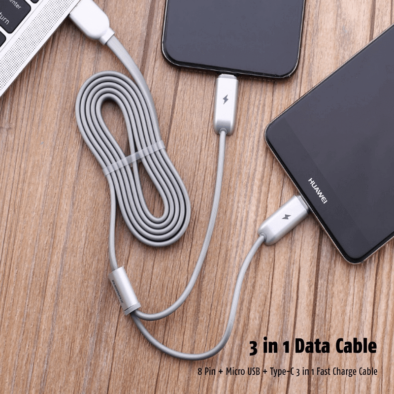 - 3 in 1 charge cable has Micro USB, Type-C and 8 Pin.